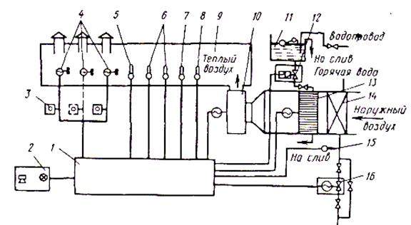 Рис. 44. Схема оборудования «Климат-2» и «Климат-3»: 1 – станция управления; 2 – панель; 3 – автоматический выключатель; 4 – вытяжные вентиляторы; 5 – датчик визуального контроля температуры воздуха; 6 – датчики контроля относительной влажности воздуха; 7 – автоматический датчик контроля температуры воздуха; 8 – датчик аварийной температуры воздуха; 9 – животноводческое помещение; 10 – центробежный вентилятор; 11 – водяной бачок; 12 – электромагнитный клапан; 13 – увлажнитель; 14 – калорифер; 15 – датчик контроля калорифера от замораживания; 16 – регулирующий клапан с исполнительным механизмом («Климат-3») Контрольные вопросы 1. Объясните устройство и принцип работы электрокалориферов серии СФОА и СФОЦ. В чем их преимущества и недостатки? 2. Каковы назначение, устройство и технологический процесс теплогенератора ТГ-1? Что и как регулируется в этом агрегате? 3. Как регулируется воздухообмен в приточно-вытяжных установках ПВУ? Как обеспечиваются приток и вытяжка воздуха? 4. Объясните устройство и принцип работы комплектов оборудования «Климат-2», «Климат-3» и «Климат-4». В чем их различие? 5. Назовите оптимальные параметры микроклимата, обеспечиваемые оборудованием «Климат». 6. Где устанавливаются осевые и центробежные вентиляторы? В чем их принципиальное отличие? 7. Из каких материалов рекомендуется изготовлять воздуховоды?