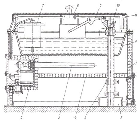 Рис. 61. Автопоилка АГК-4А: 1 – корпус; 2 – утеплительная труба; 3 – водоподводящая труба; 4 – изоляция; 5 – электронагревательный элемент; 6 – блок заземления; 7 – терморегулятор; 8 – разделитель; 9 – поплавковый механизм; 10 – клапан; 11 – крышка; 12 – поильная чаша