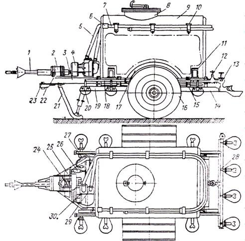 Рис. 62. Схема передвижной автопоилки ПАП-10А: а – вид сбоку: 1 – вал карданный в сборе; 2 – корпус; 3 – рама; 4 – насос; 5 – сливной рукав; 6 – фильтр; 7 – всасывающий рукав; 8 – горловина; 9 – цистерна; 10 – хомут; 11 – кронштейн; 12, 13 – вентили; 14 – рама; 15 – уголок рамы; 16 – ходовая часть; 17 – грязеотбойный щиток; 18 – магистраль левая; 19 – кронштейн левый; 20 – поилка ПА-1А; 21 – подножка; 22 – прицепная скоба; 23, 25 – плита; б – вид сверху: 24 – корпус привода насоса; 26 – главный цилиндр; 27 – гибкий шланг; 28 – фронтальная магистраль; 29 – всасывающий фланец; 30 – нагнетательный фланец