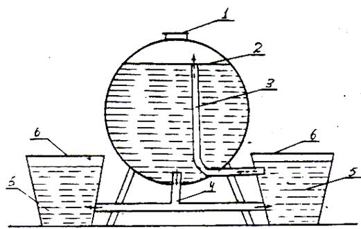 Рис. 63. Схема вакуумной поилки АГС-24: 1 – заливная горловина; 2 – водяной бак; 3 – вакуумная трубка; 4 – водяная труба; 5 – поилка; 6 – крышка поилки Групповая автопоилка ГАО-4