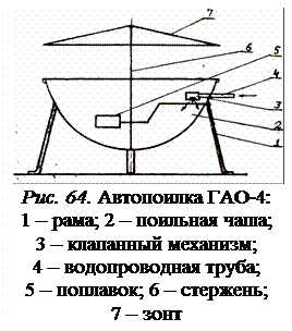 Автопоилка АГС-24 предназначена для поения свиней при групповом их содержании. Она состоит (рис. 65) из цистерны, установленной на салазках, двух корыт и вакуумного устройства, которое поддерживает уровень воды в корытах. Корыта разделены на части, которые закрыты крышками. В зимнее время поилка оборудуется электрообогревом. Поилка заправляется водой из водораздатчика. Крышка 1 герметически закрывается, на трубопроводе 4 открывается вентиль, и вода поступает в корыта, пока не перекроет вакуумную трубку 3. В этом случае доступ воздуха в резервуар 2 прекращается, в нем создается разряжение и вода в корыта больше не поступает. При поении животных уровень воды в корытах понижается, через вакуумную трубку 3 в резервуар поступает воздух, и вода снова поступает в корыта, пока не закроет вакуумную трубку.