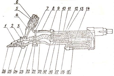Рис. 68. Стригальная машинка МСУ-200: 1 – нажимная лапка; 2 – винт с гайкой; 3 – пружина; 4 – упорный стержень; 5 – нажимной патрон; 6 – нажимная гайка; 7 – предохранительный винт; 8 – чехол; 9 – заглушка; 10, 11 – втулки; 12 – шпонка; 13 – зубчатое колесо; 14 – электродвигатель; 15, 22 – гайки; 16 – винт с пружинной шайбой; 17 – подшипник; 18 – вал эксцентрика; 19 – ролик; 20 – корпус; 21 – центр качания; 23 – рычаг; 24 – винт крепления гребенки; 25 – нож; 26 – гребенка