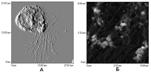 Рис. 66. Топография поверхности нейтрофила через 5 минут, после инкубации со S.аureus. (А). Структура псевдоподий со стафилококками (Б). В результате исследований установлено, что наиболее активное формирование псевдоподий происходит через 5-10 минут после инкубации и заканчивается на 20-30 минуте. Так же выявлено, что активность нейтрофилов не зависит от того, какие микроорганизмы поглощаются, а данные хемилюминесценции показывают возрастание уровня дыхательной активности после стимуляции нейтрофилов. Пик респираторного взрыва приходится на 70-90 минуту. *** СЗМ позволяет исследовать поверхностную морфологию биополимеров (типа коллагена), и “прощупывать” их внутреннюю структуру. Например, можно выявить морфологические изменения молекул коллагена при его обводненности используя СЗМ, а так же исследовать внутреннюю структуру фибрилл коллагена, используя более “жесткий” режим сканирования зондовым микроскопом. Использовался коллаген сухожилий хвоста крыс, растянутый на поверхности предметного стекла. При исследованиях в жидкости фибриллы коллагена обнаруживали плохую адгезию к поверхности подложки. Для фиксирования молекул поверхность стекла предварительно обрабатывалась 0.1 % раствором альцианового синего, что придавало подложке положительный заряд. Исследования поверхности макромолекул проводили на сканирующем зондовом микроскопе Solver Bio NT-MDT. Сканирование фиксированных препаратов осуществляли методом АСМ на воздухе. Для сканирования высушенных фибрилл на воздухе был выбран полуконтактный метод, так как при использовании контактного метода наблюдается увлечение биологического препарата зондом. Частота развертки сканирования выбиралась порядка 1-1.5 Hz. Использовались: неконтактные кремниевые зонды серии NSG11 (NT-MDT) жесткостью порядка 5 Н/м, радиусом закругления 10 нм, аспектное отношение 3:1, неконтактные зонды «вискерного» типа серии NSC05 (NT-MDT) жесткостью порядка 11 Н/м, радиусом закругления 10 нм, аспектное отношение 10:1. Сканирование обводненных молекул методом АСМ в жидкой среде проводилось на предметном стекле в капле дистиллированной воды. Для сканирования обводненных фибрилл также был выбран полуконтактный режим сканирования, но более “мягкими” зондами. Частота развертки сканирования составляла примерно 0.5 Гц. Использовались: затупленные контактные кремниевые зонды серии CSG11 (NT-MDT) жесткостью 0,03 Н/м, с радиусом закругления примерно 30 нм и резонансной частотой в пределах 15-40 KГц. В результате исследования высушенных препаратов на воздухе величина периодичности составляла порядка 67 нм. При сканировании фибрилл в жидкости было обнаружено, что период исчерченности составлял примерно 54-57 нм. Кроме того, при подробном рассмотрении выявилась “тонкая” структура – каждый пик оказывался двойным. Наличие такой структуры авторы объясняют как обводнением фибриллы, так и выявлением внутренней структуры вследствие большего воздействия на мягкую гидратированную молекулу со стороны зонда микроскопа.