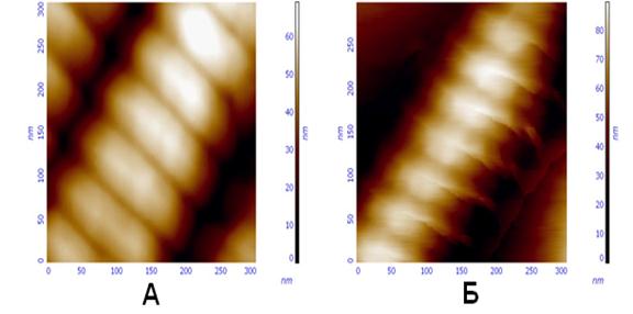 Рис. 68. Коллагеновая фибрилла на предметном стекле в жидкости. Наблюдается поперечная исчерченность поверхности фибриллы (А) и выявляется дополнительная “тонкая” структура каждого периода (Б) по сечению вдоль фибриллы. Также было установлено, что при исследовании в водной среде наблюдается деформация фибриллы – размазывание периферической части по поверхности подложки и смещение более “твердой” внутренней части в направлении быстрого сканирования. Это подтверждает предположение о двухслойной структуре молекулы коллагена.