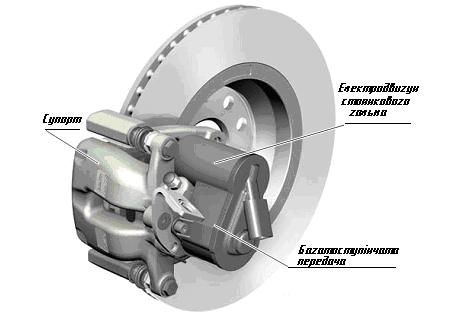Гальмівний диск; Супорт з колодками, робочим циліндром, електродвигуном стоянкового гальма, пасовою та гвинтовою передачею. При гальмуванні у процесі руху гідравлічна гальмівна система працює у звичайному режимі. Для забезпечення нерухомого стану автомобіля при зупинці водій вмикає подачу струму до електродвигуна стоянкового приводу. При роботі електродвигуна крутний момент через пасову передачу передається на гвинтову передачу, яка притискає поршень до колодки, а колодки до диска і блокує колеса.