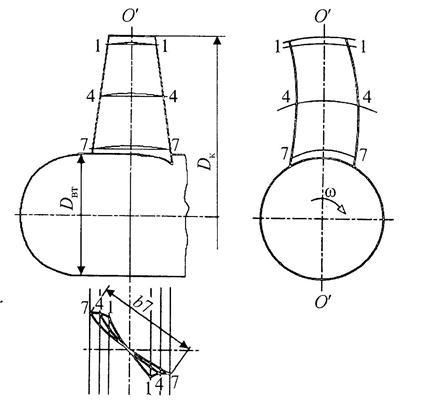 Профілювання лопаті при Розрахунки рекомендується виконувати в табличній формі (табл..1) при рівній осьовій швидкості потоку
