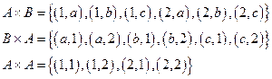Между элементами множеств можно установить отношения в виде их произведения. Декартовым произведением множеств А и В называют множество AxB всех упорядоченных пар элементов (а;b), где Пример: