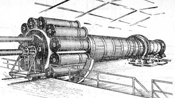 Такими холодильниками оснащали старые печи мощностью не более 1000 т/сут. Однако в последние годы значимость барабанных холодильников существенно изменилась. Увеличение их размеров (они могут быть больше размеров печей) и оснащение внутрибарабанными теплообменными устройствами позволяет эффективно использовать в комплексе с печами производительностью 3000 т/сут и более. Рекуператорные или планетарные холодильники (рис.) состоят из нескольких барабанов-рекуператоров (6…8 штук), расположенных симметрично по окружности горячего конца печи и соединённых с внутренней частью печи лейками, через которые горячий клинкер загружается в рекуператоры.