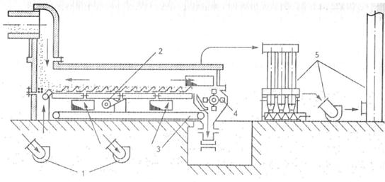 Рис.. Колосниковый холодильник: 1 – вентилятор для подачи охлаждающего воздуха; 2 – привод; 3 – транспортёр; 4 – дробилка; 5 – система пылеулавливания