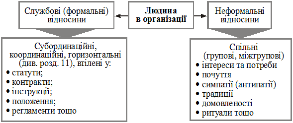 Рис. 13.1. Формальні та неформальні відносини людини в організації