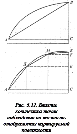 Плотность точек наблюдения при выборе сечения учитывается следующим образом. Как видно на рисунке 5.11, при наличии двух точек наблюдения А и В при линейной интерполяции фактическая кривая АВ (соответствующая картируемой поверхности) заменяется фиктивной прямой АВ, для характеристики которой достаточно двух изолиний с сечением между ними ВС. Если взять сечение меньше, то промежуточные изолинии будут характеризовать поверхность иначе. При увеличении количества точек наблюдения прямая АВ заменится ломаной ADMB, более близкой к кривой АВ. Чтобы ее охарактеризовать, нужно сгустить изолинии. Причем в верхней части кривой их следовало бы провести гуще (для отрезка MB сечение равно BF), а в нижней – реже: отрезку AD соответствует сечение ЕС. Поскольку при построении карты применяют единое значение сечения между изолиниями, рациональной величиной сечения будет значение, примерно равное средней разности между абсолютными отметками поверхности в скважинах. В данном примере следует принять, что сечение