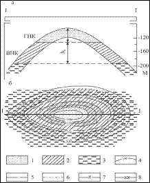 Приконтактные залежи образуются в продуктивных пластах, контактирующих с соляным штоком, глиняным диапиром или с вулканогенными образованиями. Класс литологических залежей. В составе этого класса выделяются две группы: залежи литологически экранированные (рис. 5.6, г) и залежи литологически ограниченные (рис. 5.6, д). Литологически экранированные залежи располагаются в участках выклинивания пласта-коллектора. Литологически ограниченные залежи приурочены к песчаным образованиям ископаемых русел палеорек (шнурковые или рукавообразные), к прибрежным песчаным валоподобным образованиям или же к гнездообразно залегающим породам-коллекторам, окруженным со всех сторон слабопроницаемыми породами. Класс рифогенных залежей (рис. 5.6, е). Залежи этого класса образуются в теле рифовых массивов. Залежи стратиграфического класса (рис. 5.6, ж). Формирование залежей этого класса происходило в пластах-коллекторах, до этого срезанных эрозией и стратиграфически несогласно перекрытых непроницаемыми слоями более молодого возраста. Залежи стратиграфического класса могут быть обнаружены в антиклинальных, куполовидных и моноклинальных структурах. К ним относят и залежи, приуроченные к выветрелой части погребенных выступов кристаллических пород фундамента.