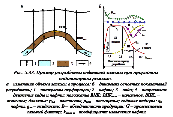 Природным режимом залежи называют совокупность естественных сил (видов энергии), которые обеспечивают перемещение нефти или газа в пласте к забоям добывающих скважин. В нефтяных залежах к основным силам, перемещающим нефть в пластах, относятся: · напор контурной воды под действием ее массы – водонапорный режим (жестководонапорный) (рис. 5.32 а); · напор контурной воды в результате упругого расширения породы и воды – упруговодонапорный режим; · давление газа газовой шапки – газонапорный (режим газовой шапки) (рис. 5.32 б); · упругость выделяющегося из нефти растворенного в ней газа – режим растворенного газа (рис. 5.32 в); · сила тяжести нефти – гравитационный режим (рис. 5.32 г). В газовых и газоконденсатных залежах источниками энергии является давление, под которым находится газ в пласте, и напор краевых пластовых вод. Соответственно различают газовый и упруговодогазонапорный режимы. Природный режим залежи определяется главным образом геологическими факторами: характеристикой водонапорной системы, к которой принадлежит залежь, и расположением залежи в этой системе относительно области питания; геолого-физической характеристикой залежи – термобарическими условиями, фазовым состоянием УВ, условиями залегания и свойствами пород-коллекторов и другими факторами; степенью гидродинамической связи залежи с водонапорной системой. На режим пласта существенное влияние могут оказывать условия эксплуатации залежей. При использовании для разработки залежи природных видов энергии от режима зависят интенсивность падения пластового давления и, следовательно, энергетический запас залежи на каждом этапе разработки, а также поведение подвижных границ залежи (ГНК, ГВК, ВНК) и соответствующие тенденции изменения ее объема по мере отбора запасов нефти и газа. Все это необходимо учитывать при выборе плотности сети и расположения скважин, установлении их дебита, выборе интервалов перфорации, а также при обосновании рационального комплекса и объема геолого-промысловых исследований для контроля за разработкой. Природный режим при его использовании обусловливает эффективность разработки залежи – темпы годовой добычи нефти (газа), динамику других важных показателей разработки, возможную степень конечного извлечения запасов нефти (газа) из недр. Продолжительность эксплуатации скважин различными способами, выбор схемы промыслового обустройства месторождения и характеристика технологических установок по подготовке нефти и газа также во многом зависят от режима залежи. Знание природного режима позволяет решить один из центральных вопросов обоснования рациональной системы разработки нефтяных и газоконденсатных залежей: возможно ли применение системы с использованием природных энергетических ресурсов залежи или необходимо искусственное воздействие на залежь? Режим залежи при ее эксплуатации хорошо характеризуется кривыми, отражающими в целом по залежи поведение пластового давления, динамику годовой добычи нефти (газа) и воды, промыслового газового фактора. Все эти кривые в совокупности с другими данными об изменении фонда скважин, среднего дебита на одну скважину и т. д. представляют собой график разработки залежи. Ниже рассмотрим режимы с преобладанием одного из видов природной энергии для нефтяных залежей. 5.3.5.1. Водонапорны