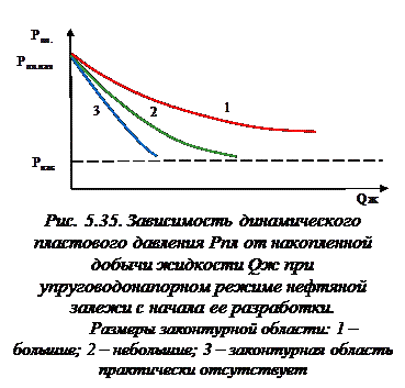 Водонапорный режим отличают следующие особенности динамики показателей разработки (рис. 5.33 б): · тесная связь поведения динамического пластового давления с величиной текущего отбора жидкости из пласта – относительно небольшое снижение его при увеличении отбора, неизменная величина при постоянном отборе, увеличение при уменьшении отбора, восстановление почти до начального пластового давления при полном прекращении отбора жидкости из залежи; область снижения давления обычно ограничивается площадью залежи; · практически неизменные на протяжении всего периода разработки средние значения промыслового газового фактора; · достигаемый высокий темп годовой добычи нефти в период высокой стабильной добычи нефти, называемый II стадией разработки, ‑ до 8 – 10% в год и более от начальных извлекаемых запасов (НИЗ); отбор за основной период разработки (за первые три стадии) около 85 – 90% извлекаемых запасов нефти; · извлечение вместе с нефтью в период падения добычи нефти попутной воды, в результате чего к концу разработки отношение накопленных отборов воды и нефти (водонефтяной фактор – ВНФ) может достигать 0,5 – 1. При водонапорном режиме достигается наиболее высокий коэффициент извлечения нефти – до 0,6 – 0,7. Это обусловлено способностью воды, особенно пластовой минерализованной, хорошо отмывать нефть и вытеснять ее из пустот породы-коллектора, а также сочетанием исключительно благоприятных геолого-физических условий, в которых действует рассматриваемый режим. Водонапорным режимом характеризуются отдельные залежи в терригенных отложениях Грозненского района, Куйбышевской, Волгоградской и Саратовской областей и некоторых других районов. 5.3.5.2. Упруговодонапорный режим Режим, при котором нефть вытесняется из пласта под действием напора краевой воды, но в отличие от водонапорного режима основным источником энергии при этом служит упругость пород-коллекторов, сжатых в недрах под действием горного давления и насыщающей их жидкости. Отличительной особенностью упруговодонапорного режима является то, что водоносная часть пласта значительно больше нефтеносной (границы водоносной части отстоят от контура нефтеносности на 100 км и более). При этом режиме отбор жидкости не полностью компенсируется внедряющейся в залежь водой. В результате снижение давления в пласте постепенно распространяется за пределы залежи и захватывает большую область водоносной части пласта. В этой области происходит соответствующее расширение породы и пластовой воды. Коэффициенты упругости воды и породы незначительны, но при больших размерах области сниженного давления, во много раз превышающих размеры залежи, упругие силы пласта служат источником значительной энергии. Коэффициент нефтеотдачи также может достигать 0,7. Объем нефти DVн, получаемой из залежи за счет упругих сил при снижении в ней пластового давления на DР, можно выразить формулой: