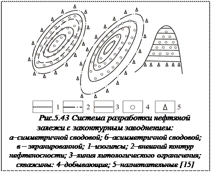 Выбор вида заводнения определяется типом залежи, размерами залежи и ее водонефтяной зоны, вязкостью пластовой нефти, типом породы-коллектора и ее проницаемостью, степенью неоднородности пластов, строением залежи в зоне ВНК, наличием дизъюнктивных нарушений и др. Ниже приведены характеристики различных видов заводнения и геологические условия, для которых они в основном могут рекомендоваться. Законтурное заводнение. При этой разновидности заводнения нагнетательные скважины располагаются в законтурной части продуктив