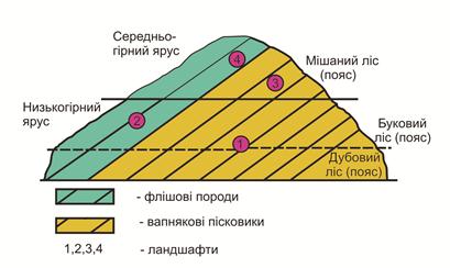 Рисунок А.4 – Схема диференціації ярусів і ландшафтів гірських країн (за А.Г. Ісаченком, 1965). Яруси: 1-низькогірний; 2-середньогірний; 3-високогірний. Ландшафти: а, б, г – низькогірні; в – середньогірні; д, е - високогірні