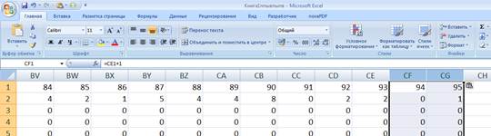 на формулу: =Е1+1 Копируем колонку F1:F1034 вправо до столбца CG1:CG1034: