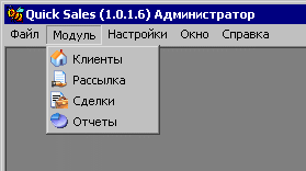 Рис. 3. Главное окно системы. Меню Модуль Здесь представлено четыре пункта: · Клиенты. Служит для запуска модуля Клиенты (в системе Quick Sales – это основной модуль для работы менеджера по продажам, ниже вы познакомитесь с его подробным описанием). · Рассылка. Этот модуль позволяет отправлять типовые рекламные материалы или прайс-листы клиентам. · Сделки. Этот модуль предназначен для контроля активности работы с клиентами: поиска и анализа сделок, а также этапов сделки: инициирование интереса, согласования договора, переговоров и т. д. · Отчеты. Позволяет формировать сводные и детализированные отчеты по продажам в стоимостном и количественном выражении в различных разрезах: товары, регионы, отрасли, каналы продвижения. Самым основным в локальной версии является модуль Клиенты. В этом кратком руководстве описываются возможности именно модуля Клиенты. Другие модули подробно рассмотрены в полном руководстве пользователя Quick Sales: Пуск/Программы/Quick Sales Free/Руководство пользователя QS. А сейчас приступим к знакомству непосредственно с функциями Quick Sales (лок.) – к пункту меню Клиенты.