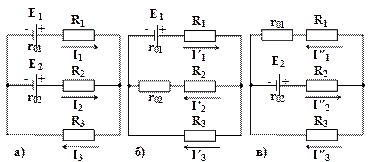 Рис. 2.1. К расчету цепи методом наложения токов: а – действуют ЭДС Е 1 и Е 2; б – действует только ЭДС Е 1; в – действует только ЭДС Е 2. Сначала рассмотрим цепь при действии только ЭДС Е1 (рис. 2.1, б) и определим частичные токи I′1, I′2, I′3:
