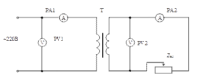 Рис. 10.3. Схема включения однофазного трансформатора: Z нг – ламповый резистор; РА1 – амперметр на 2 А; РА2 – амперметр на 10 А; PV1 – вольтметр на 250 В; PV2 – вольтметр на 50 В; Т – однофазный трансформатор