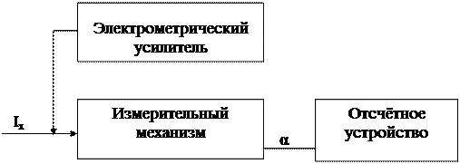 Амперметры состоят из измерительного механизма который является основной частью конструкции прибора, преобразует электромагнитную энергию в механическую необходимую для угла отклонения a его подвижной части относительно неподвижной. Отсчетное устройство предназначено для преобразования сигнала подаваемого от измерительного механизма, в сигнал удобный для отсчета. В случае малых токов вводится электрометрический усилитель.