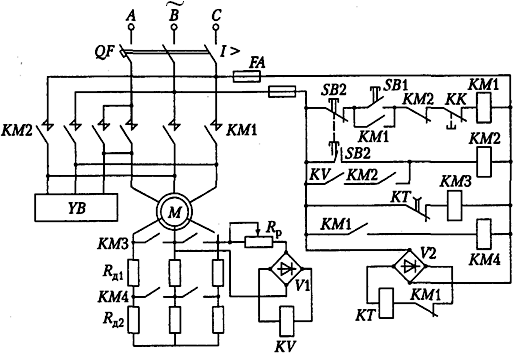 Для осуществления торможения двигателя нажимается сдвоенная кнопка SB2, размыкающий контакт которой разрывает цепь питания катушки контактора КМ1. После этого двигатель отключается от сети и разрывается цепь питания контактора КМ4 и замыкается цепь питания реле КТ. В результате этого контакторы КМЗ и КМ4 отключаются и в цепь ротора двигателя вводится сопротивление RД1 + RД2. Нажатие кнопки SB2 приводит одновременно к замыканию цепи питания катушки контактора КМ2, который, включившись, вновь подк-лючает двигатель к сети, но уже с другим чередованием фаз сетевого напряжения на статоре. АД переходит в режим торможения противов-ключением. Реле KVсрабатывает и после отпускания кнопки SB2 будет обеспечивать питание контактора КМ2 через свой контакт и замыка-ющий контакт этого аппарата. В конце торможения, когда скорость будет близка к нулю и ЭДС ротора уменьшится, реле KV отключится и своим размыкающим контак-том разомкнет цепь катушки контактора КМ2. Последний, потеряв пита-ние, отключит двигатель от сети, и схема придет в исходное положение. После отключения КМ2 тормоз YB, потеряв питание, обеспечит фик-сацию (торможение) вала двигателя.