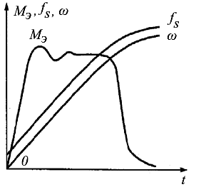 Для стабилизации момента дви-гателя и соблюдения закона нараста-ния частоты питания в переходных процессах в структуру рис. 8.26,а, вводится отрицательная ОС по току статора или положительная ОС по скорости. Эти обратные связи явля-ются нелинейными (или задержанными) и в установившемся режиме должны быть отключены. Вместо этих ОС, называемых формирующими, применяется задатчик интенсивности SJ (в схеме на рис. 8.26,а обведен штриховой линией), который обеспечивает формирование требуемого закона изменения частоты U3M. Переходные процессы момента МэМЭ, час-тоты статора /fs и скорости при сопри пуске АД в такой системе приведены на рис. 8.28,б27. Система обеспечивает линейное нарастание частоты и пуск двигателя с постоянным ускорением. Задача замкнутой системы регулирования с автономным инвер-тором тока (рис. 8.2289,а) – — формирование частоты переключения тиристо-ров VS1...VS6 (см. рис. 8.24) и тем самым частоты тока статора fS /s, а также регулирование амплитуды тока статора, для чего воздействие про-изводится на управляемый выпрямитель U. Система содержит два контура:1) контур регулирования тока, со-держащий регулятор тока (РТ), функциональный преобразователь (ФП), датчик тока (RS) и СИФУ; 2) контур регулирования скорости вращения АД, состоящий из регулятора скорости (PC), датчика скорости (BR), регулятора частоты (РЧ) (генератора импульсов) и распределителя им-пульсов (РИ). Частота тока формируется инвертором АИТ таким обра-зом, что в любой рабочей точке справедливо соотношение: