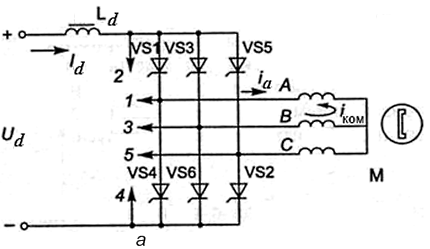 Преобразование постоянного тока источника в переменный ток в фазах ВД (инвертирование тока) осуществляется с помощью инверторов (преобразователей мощности). Для ЭП-ВД большой мощности в качестве ключевых элементов применяются тиристоры, для отключения которых используются схемы либо с искусственной, либо с естественной (называемой также машин-ной) коммутацией. При естественной коммутации используется ЭДС вращения, наводимой в обмотках статора, для создания паузы прохож-дения тока, в течение которой тиристор запирается. Схема трехфазного тиристорного мостового инвертора с машинной коммутацией рис.11.9,а. Электромагнитные процессы в ВД носят цикли-ческий характер; период каждого цикла определяется угловым расстоя-нием между двумя соседними чувствительными элементами или проме-жутками времени между двумя следующими друг за другом коммута-циями фаз. При числе фаз, равном трем, этот угловой период равен π/3. Для анализа квазиустановившегося режима достаточно рассмотреть процессы внутри только одного какого-либо периода, выделив два участка, комму-тационный и внекоммутационный. На коммутационном участке фаза А выходит из работы, для чего тиристор VS1 должен выключиться, фаза В включается в работу за счет отпирания тиристора VS3. Длительность коммутационного процесса определяется углом коммутации. Для обес-печения коммутации с фазы А на фазу В, тиристор VS3 необходимо включить левее точки пересечения фазных ЭДС е а и е b, т.е. в момент времени, когда е а > е b; угловой сдвиг влево относительно точки пересе-чения фазных ЭДС коммутируемых фаз называется текущим углом опе-режения. В контуре коммутации, состоящем из фаз А, В и тиристоров VS1 и VS3, проходит коммутационный ток IКОМ и VS1 запирается. Процесс коммутации заканчивается при i a =0, после чего необходимо создание паузы t0 для восстановления запирающих свойств тиристора (t0 = 10...15мкс). Машинная коммутация значительно упрощает схему пре-образователя, но проблемы возникают при пуске ВД, когда ЭДС в обмотках отсутствуют. Для обеспечения пуска применяют асинхронный пуск, временный перевод инвертора в режимискусственной коммутации и др., что в целом усложняет схему ЭП.