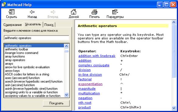 · Меню Insert (Вставка) — позволяет помещать в MathCAD – документ графики, функции, матрицы, гиперссылки, компоненты и настраивать объекты. · Меню Format (Формат) — содержит команды, предназначенные для задания различных параметров, определяющих внешнее представление чисел, формул, текста, абзацев, колонтитулов и т.д. · Меню Math (Математика) — позволяет установить режимы и параметры вычислений. · Меню Symbolics (Символы) — реализует символьные вычисления. · Меню Window (Окно) — содержит команды для упорядочения взаимного расположения нескольких окон и позволяет активизировать одно из них. · Меню Help (Помощь) — информационный центр и справочники. Команда Help открывает окно, представленное на рис. 5.3. На вкладке «Содержание» справочные сведения распределены по темам. На вкладке «Указатель» темы представлены в алфавитном порядке. Вкладка «Поиск» позволяет находить конкретное понятие.