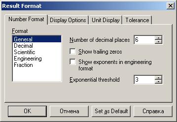 Количество значащих цифр, отображаемых при вычислении,можно регулировать с помощью команды главного меню Format→Result. В этом случае команда предоставит диалоговое окно, как это показано на рис. 5.5, в котором следует переустановить параметры для вывода результата.