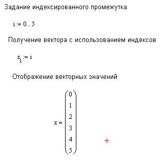 В системе предусмотрены различные возможности задания векторов и матриц: 1. Определение матрицы последовательным заданием каждого элемента. 2. С помощью индексированных переменных. 3. С помощью использования команды Insert→Matrix, либо с помощью соответствующей кнопки панели Matrix. 4. Задание с помощью элементов программирования. 5. Применение встроенных функций. 6. Через связь с другим приложением, например Excel. 7. Создание таблицы данных. 8. Чтение из внешнего файла. Рассмотрим некоторые из них. Определение матрицы последовательным заданием каждого элемента очевидно и не требует пояснений. При создании матрицы или вектора с помощью индексированной переменной следует исходить из того, что любая индексированная переменная, индексами которой являются переменные, принимающие целочисленные значения из некоторого промежутка, уже представляют собой вектор или матрицу. Пример 1. Требуется сформировать вектор x, состоящий из 6 элементов. Элементам этого вектора присвоить значения индексов. Решение. Предоставим два варианта решения этой задачи: a) с помощью индексированной переменной; b) с помощью команды Insert→Matrix. Вариант а Для того, чтобы сформировать вектор, воспользуемся вспомогательной переменной, которая будет играть роль индекса (например, i), а затем будем использовать эту переменную для здания элементных значений вектора x. Формирование вектора представлено на рис. 7.1.