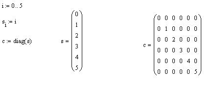 Пример 3. Требуется сформировать диагональную квадратную матрицу с (6x6). Значения элементов главной диагонали должны совпадать с номером строки/столбца. Решение. Для получения диагональной матрицы в системе предусмотрена функция diag, которая имеет один параметр – вектор диагональных элементов. Поэтому формирование матрицы начнем с создания вспомогательного вектора, в который занесем элементы для диагонали. Для формирования этого вспомогательного вектора (например, с именем s), воспользуемся вспомогательной переменной, которая будет играть роль индекса (например, i). Тогда формирование диагональной матрицы может быть получено в результате операций, как это показано на рис. 7.6.