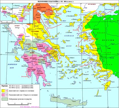 в соучастии с теми, кто хотел ниспровергнуть демократию; иные, впрочем, пали жертвой личной вражды, другие убиты были должниками из-за денег, которые они были должны. Вообще смерть царила во всех видах, происходило все то, что обычно бывает в подобные времена, и даже больше: отец убивал сына, молящихся отрывали от святынь, убивали и подле них; некоторые были замурованы в святилище Диониса и там погибли». События на Лесбосе и Керкире обнаружили слабое место в афинской обороне – возможность сепаратных выступлений союзников, возможность распада державы. Война, которую афиняне вели прежде всего в собственных интересах, лишь стимулировала недовольство союзников. Вместе с тем отношение к Афинам становилось поводом к внутренней распре в союзных городах: имущие группировки, на которые главным образом ложилось финансовое бремя, все более зажигались антиафинскими настроениями; демос же, как правило, стоял за сохранение союза с Афинами. Следствием было все более тесное переплетение военных событий с социальными смутами, все большее превращение Пелопоннесской войны из собственно военного столкновения во всегреческий социально-политический конфликт. Спартанцы в 425 г, в пятый раз вторглись в Аттику. Но афиняне незаметно высадили на Пелопоннесе морской десант под руководством стратега Демосфена. Это вынудило спартанцев вернуться. Здесь состоялось морское сражение в котором одержали победу афиняне. Спартанцы предложили начать переговоры. Но вместо этого с подмогой сюда был направлен Клеон, сторонник продолжения войны, и ему удалось одержать победу и занять о-в Сфактерию. В руки афинян попало много знатных спартанцев, и они пригрозили Спарте, что в случае повторения вторжений в Аттику пленники будут казнены. Афиняне теперь твердой ногой стояли в Мессении, и их присутствие здесь сковывало все действия Спарты. Вес Афин в их собственной державе также неизмеримо возрос, и, пользуясь этим, Клеон настоял на важной финансовой реформе: зимой 425/24 г. раскладка союзной подати была радикально пересмотрена; взносы отдельных городов были увеличены почти вдвое. Афиняне получили дополнительные средства для ведения наступательной войны. Удачно начавшаяся кампания 424 г. окончилась поражением афинян в Беотии. В то же время неприятным образом осложнилось для афинян положение на севере. Молодой спартанский полководец Брасид выдвинул блестящую идею – открыть новый фронт во Фракии, привлечь на свою сторону недовольных афинских союзников и нанести, таким образом, удар по тылам Афинской державы. С согласия спартанского правительства Брасид составил небольшой отряд из илотов и наемников, смело прошел через всю Грецию и появился на Халкидике. Македонский царь Пердикка немедленно перешел на сторону Спарты, а среди афинских союзников началось брожение. Продвинувшись дальше во Фракию, Брасид овладел г. Амфиполем – опорой афинского владычества на севере. Будущий историк, а тогда афинский стратег Фукидид не сумел предупредить переход Амфиполя к Спарте и поплатился за это изгнанием из Афин. Окончился неудачей и поход афинян в Сицилию. Эта серия неудач поколебала авторитет военной партии. Со Спартой вновь были начаты переговоры и было заключено годичное перемирие. По истечении года Клеон настоял на возобновлении военных действий. Он лично возглавил похо