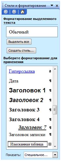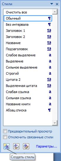 Способ создания стиля пользователя: 1. Выделить фрагмент документа, отформатировать его, применив форматирование символов и абзаца. 2. Не снимая выделения выполнить команду: Формат – Стили и форматирование (для Office2003) или Главная – Стили(для Office2007), при выполнении которой откроется соответственное окно.