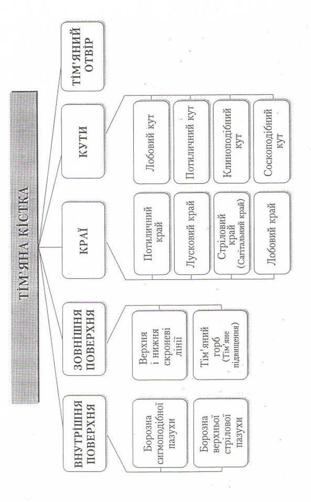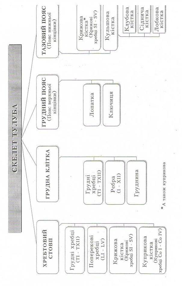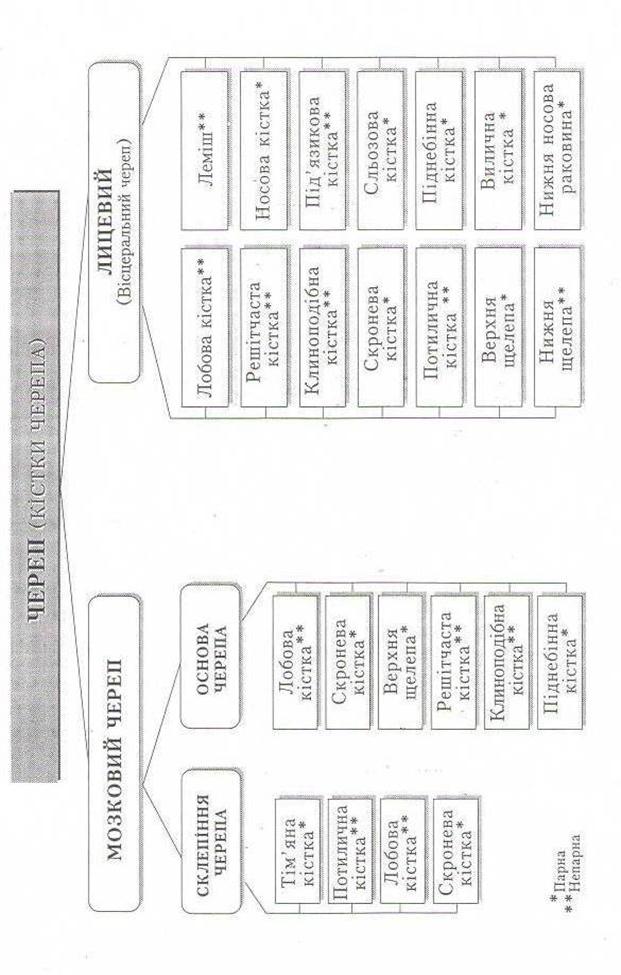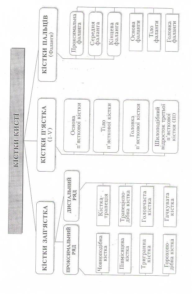 Додаток 3 ПИТАННЯ ДЛЯ САМОКОНТРОЛЮ 1.Значення скелета в організмі людини. 2.Склад кістки як органу. 3.Будова компактної та губчастої речовин кістки. 4.Будова і значення періосту. 5.Види і розташування кісткового мозку. 6.Стадії розвитку кісток. 7.Форми кісток. 8.Будова трубчастої кістки. 9.Будова коротких кісток. 10.Будова плоских кісток. 11.Основні види з'єднання кісток. 12.Основні елементи суглоба. 13.Будова суглобової капсули. 14.Види суглобів за кількістю осей. 15.Види суглобів за формою суглобових поверхонь. 16.Які рухи можливі навколо фронтальної та сагітальної осей? 17.Які рухи називають супінацією та пронацією? 18.Допоміжні елементи суглоба. 19.Які кістки формують скелет тулуба? 20.Кількість хребців. 21.Будова хребця. 22.Основні відмінності шийних, грудних, поперекових та куприкових хребців. 23.Особливості будови І і II шийних хребців. 24.Будова крижової кістки. 25.З’єднання хребців. Хребтовий стовп. 26.Вкажіть згини хребтового стовпа. 27.Кількість ребер, їх класифікація. 28.Будова ребра. 29.Будова груднини. 30.З’єднання кісток грудної клітки. 31.Верхня та нижня апертури (отвори) грудної клітки. 32. Відділи верхньої і нижньої кінцівок. 33.З яких кісток складається пояс верхньої кінцівки? 34.Відділи скелета вільної верхньої кінцівки. 35.Будова лопатки. 36.Будова ключиці. 37.Будова плечової кістки. 38.Будова променевої кістки. 39.Будова ліктьової кістки. 40.Кістки кисті, відділи, кількість кісток у кожному відділі. 41.Кістки зап’ястка. 42.Будова груднинно-ключичного суглоба. 43.Будова плечового суглоба 44.Будова ліктьового суглоба. 45.Дистальний і проксимальний променево-ліктьові суглоби. 46.Назви кісток тазового пояса. 47.Будова лобкової, клубової, сідничої кісток. 48.З'єднання кісток таза. 49.Статеві відмінності таза. 50.Зовнішні розміри жіночого таза. 51.Внутрішні розміри жіночого таза. 52.Відділи вільної нижньої кінцівки. 53.Будова стегнової кістки. 54.Будова великогомілкової і малогомілкової кісток. 55.Відділи стопи; будова кісток передплесна, плесна та фаланг пальців. 56.Будова кульшового суглоба. 57.Будова колінного суглоба. 58.Будова гомілковостопного суглоба. 59.Склепіння стопи. 60.Значення кісток черепа. 61.Перелічіть кістки мозкового черепа. 62.Перелічіть кістки лицевого черепа. 63.Будова потиличної кістки. 64.Будова тім'яної кістки. 65.Будова лобової кістки. 66.Будова скроневої кістки. 67.Будова решітчастої кістки. 68.Будова і складові клиноподібної кістки. 69.Будова верхньої щелепи. 70.Будова нижньої щелепи. 71.Будова піднебінної кістки. Тестові завдання І. За розвитком, формою і функцією кістки організму людини поділяють на: 1.Довгі. 2.Короткі. 3.Плоскі. 4.Повітроносні. а б в г д усі відповіді II. Деякі кістки тіла людини сполучаються між собою за допомогою нерухомих з'єднань, які називаються: 1.Синдесмози. 2.Діартрози. 3.Синхондрози. 4.Синостози. а б в г д усі відповіді III. Залежно від кількості кісток, що утворюють суглоб, розрізняють суглоби: 1. Прості. 2.Комбіновані. 3.Кулясті. 4.Складні. 5.Багатоосьові а б в г д усі відповіді IV. Скелет людини складається з таких частин: 1. Скелета тулуба. 2.Скелета черепа. 3.Скелета тазового пояса. 4.Скелета верхніх кінцівок. 5. Скелета нижніх кінцівок. а б в г д усі відповіді V. Хребці мають такі відростки, які відходять від дуги: 1. Остистий відросток. 2.Поперечні відростки. 3.Верхні суглобові. 4.Нижні суглобові. 5.Бічні маси. а б в г д усі відповіді VI. Хребтовий стовп людини 