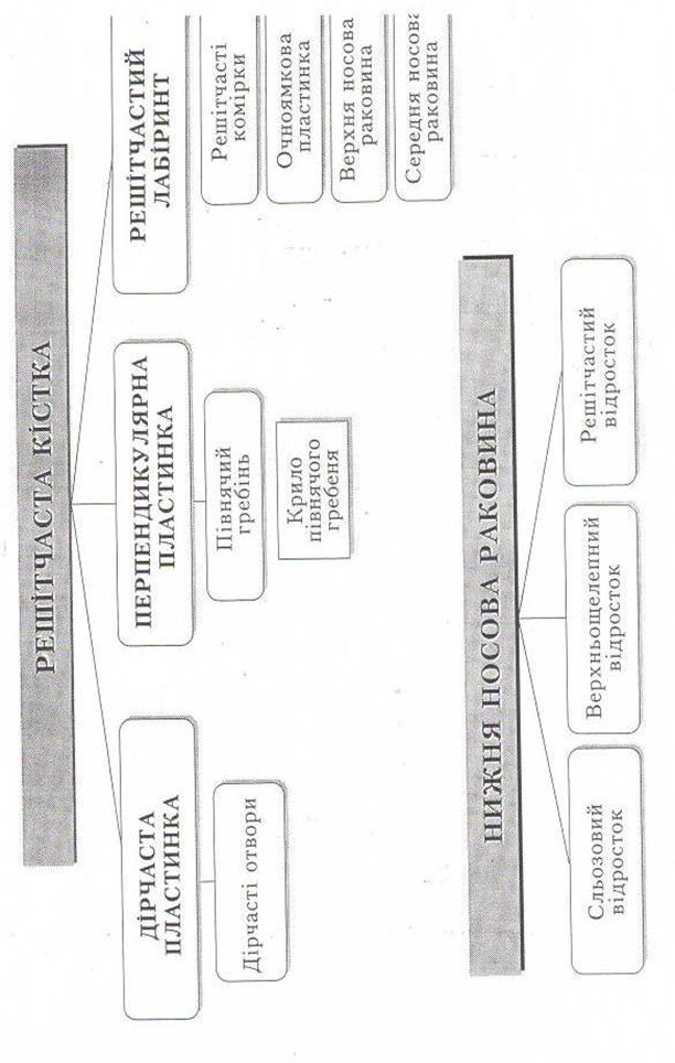 Іл. 47. Решітчаста кістка. 1 – півнячий гребінь; 2 – очноямкова пластинка; 3 – решітчасті комірки; 4 – середня носова раковина; 5 – решітчастий пухирець; 6 – перпендикулярна пластинка.