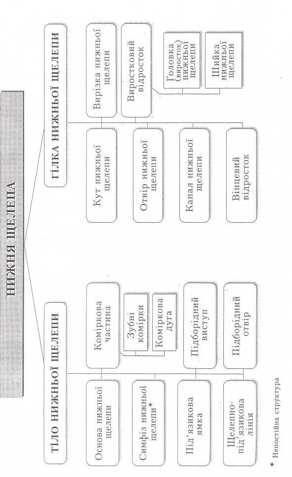 Б – вигляд зсередини (права половина). 1 – вінцевий відросток; 2 – вирізка; 3 – виростковий відросток; 4 – крилоподібна ямка; 5 – отвір нижньої щелепи; 6 – кут; 7 – крилоподібна горбистість; 8 – щелепно-під’язикова борозна; 9 – щелепно-під’язикова лінія; 10 – піднижньощелепна ямка; 11 – під’язикова ямка; 12 – двочеревцева ямка; 13 – язичок.