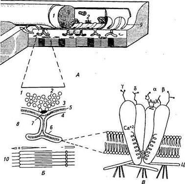 Рис. 2.21. Схема нервно-мышечного синапса (концевой пластинки) и ацетил-холинактивируемого ионного канала: А - тоехмеоная реконструкция нервно-мышечного синапса: 1 - терминальная часть нервного при изменении мембранной проницаемости для какого-либо иона мембранный потенциал согласно уравнению Голдмана (17) оудет смещаться до нового уровня. Если проницаемость для данного иона увеличится, мембранный потенциал сместится ближе к равновесному потенциалу для этого иона. И наоборот, уменьшение проницаемости вызовет смещение в противоположную сторону от равновесного потенциала. В ответ на АцХ каналы концевой пластинки становятся одновременно проницаемы для ионов натрия и калия. При этом возникает смешанный ионный ток, под деистви- ем которого потенциал постсинаптической мембраны смещается к новому уровню, так называемому потенциалу реверсии, занимающему промежуточное положение между равновесными потенциалами для этих двух проникающих ионов и равному -10 мВ. В общем случае потенциал реверсии для ионных токов, переносимых двумя ионами, зависит от двух главных факторов: относительной проницаемости активированного канала для проникающих ионов; равновесных потенциалов для этих ионов, зависящих, в свою очередь, от их концентрационных градиентов. Постсинаптические каналы открываются на короткое время (на несколько мс), поскольку АцХ быстро подвергается ферментативному расщеплению ацетилхолинэстеразой (АцХЭ), которая располагается в области субнейрональных складок. АцХ- активируемый канал. Успехи в совершенствовании методов молекулярной биологии, а также электрофизиологических методов позволили выделить, идентифицировать и изучить АцХ-ак-тивируемый канал — интегральный белок мышечной мембраны. АцХ-активируемый канал состоит из пяти белковых субъединиц, которые образуют трубчатую структуру с общей молекулярной массой около 250 000. Канал выступает из мембраны с обеих сторон, причем над наружной ее поверхностью возвышается воронкообразная структура — вход в канал (см. рис. 2.21, В). Рецептор-ный участок канала состоит из двух белковых субъединиц и располагается на наружной поверхности мембраны. Каждая из белковых субъединиц содержит участок связывания АцХ. Если к этим двум участкам присоединяется АцХ, то канал с высокой вероятностью переходит из закрытого состояния в открытое и через него течет ионный ток. Регистрацию ионного тока через отдельные АцХ-каналы удалось осуществить с помощью методики локальной фиксации немецкими учеными Э. Неером и Б. Сакманом в середине 70-х годов XX в. (см. функционирование потенциалзависимого натриевого канала). Здесь надо отметить, что в норме АцХ-каналы и связанные с ними АцХ-рецепторы сосредоточены в постсинаптической мембране концевой пластинки и плотность их весьма велика — около 104/мкм2. В остальной части мышечной мембраны их нет, и именно из-за этого в норме не иннервированная часть мышечных волокон нечувствительна к действию АцХ. Однако если перерезать двигательный нерв, то зона чувствительности к АцХ постепенно распространяется от концевой пластинки, охватывая всю мембрану мышечного волокна. Значит, рецепторы и каналы появляются во внесинаптических участках. В нормальных условиях эти внесинаптические каналы каким-то образом блокированы малоизученным трофическим влиянием нервно