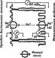 % Рис. 8.7. Схема внутриклеточной реабсорбции натрия Дистальная реабсорбция ионов и воды. В этом отделе нефрона происходит активная реабсорбция около 10 % натрия, что создает значительный градиент осмотического давления между мочой и межклеточной тканью. Хлор всасывается пассивно вслед за натрием. Эпителий дистального канальца в обмен на ионы натрия удаляет в мочу Н-ионы (этот вид ионообменных процессов называется антипорт). Наряду с этим в дистальном отделе активно всасываются калий, кальций и фосфаты. Концентрирование и разведение мочи. Среди позвоночных только у млекопитающих и птиц образуется моча, гиперосмотичная по отношению к плазме крови. В ходе эволюции складывалась различная степень способности к концентрации мочи: при необходимости сберегать воду у пустынных животных моча в 25 раз концентрированнее плазмы крови, а у животных, имеющих свободный доступ к воде (бобр, свинья), концентрирующие возможности выражены весьма умеренно (табл. 8.1.).