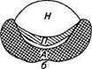 Рис. 12.6. Схема строения гипофиза: а — сагиттальный и б— фронтальный срезы; А — аденогипофиз; П— промежуточная доля; Н— нейрогипофиз от гипоталамуса к гипофизу. Из синусоидов передней доли кровь вытекает через боковые гипофизарные вены в кавернозные синусы. Промежуточная доля гипофиза сравнительно бедна кровеносными сосудами, а кровоснабжение задней доли гипофиза не связано с кровоснабжением передней доли, она получает кровь от нижних гипофизарных артерий и отдает ее через многочисленные вены в кавернозные синусы. Симпатические нервные волокна к гипофизу подходят из верхнего шейного ганглия, сопровождая кровеносные сосуды. Остальные нервные волокна в гипофиз идут из гипоталамуса в составе гипоталамо-гипофизарного тракта, причем большинство его волокон оканчивается в задней доле, но часть проникает в промежуточную и переднюю доли. Для каждой доли гипофиза характерна своя структурная организация, обеспечивающая выполнение специфической функции в системе координации эндокринных регуляторных влияний. Аденогипофиз. По своей цитоархитектонике представляет собой сложную железу, образованную тяжами эпителиальных клеток (аденоцитов), разделенных развитой сетью синусоидных капилляров. По данным светомикроскопического, цитохимического и электронно-микроскопического исследований определены структурные и функциональные особенности различных аденоцитов. Выявлено шесть разновидностей клеток, ответственных за синтез определенного тропного гормона (рис. 12.7).