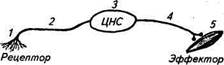 Рис. 13.6. Схема рефлекторной дуги: / — афферентный нейрон; 2—афферентный (центростремительный) нерв; 3 — нервный центр; 4— эфферентный (центробежный) нерв; 5—эффектор (исполнительный орган) Рефлексы подразделяют по характеру ответных реакций в зависимости от того, какие органы в ней участвуют, на моторные, или двигательные, в которых исполнительным органом служат мышцы; сосудодвигательные, проявляющиеся в сужении или расширении кровеносных сосудов; секреторные, которые заканчиваются секрецией желез. Рефлексы классифицируют по месту расположения нервных центров на спиналъные, в которых принимают участие нейроны спинного мозга; бульварные, осуществляемые при участии нейронов продолговатого мозга; мезэнцефальные, осуществляемые при участии нейронов среднего мозга; диэнцефалъные, в которых участвуют нейроны промежуточного мозга; кортикальные, в осуществлении которых принимают участие нейроны коры больших полушарий головного мозга. Рефлексы разделяют и по биологическому значению — на пищевые, оборонительные, половые, тонические, ориентировочные, локомоторные и др. По месту раздражения и ответной реакции рефлексы бывают кутано-висцеральные, осуществляемые с кожи на внутренние органы; висцеро-кутанные — с внутренних органов на кожу; висцеро-висцеральные — с внутренних органов на внутренние органы. Рефлексы бывают моносинаптическими и полисинаптически-ми. Моносинаптические — это простейшие рефлексы, поступающие в ЦНС по афферентному пути, переключающиеся непосредственно на эфферентный нейрон. Но рефлекторные дуги большинства рефлексов состоят не из двух, а из большего количества нейронов: афферентный, один или несколько вставочных и эфферентный. Такие рефлекторные дуги называют многонейронными, или полисинаптическими. Наиболее простая из этих дуг образована тремя нейронами; в ней имеется два синапса. Схемы моно- и даже полисинаптических рефлекторных дуг дают упрощенное представление о составе нейронов, участвующих в том или ином рефлекторном акте, без учета всей сложности путей распространения импульсов по многочисленным проводящим путям в ЦНС при всяком рефлексе. По своему строению различают дуги вегетативного и соматического рефлексов. Различие состоит в том, что эфферентный путь вегетативного рефлекса состоит из двух нейронов — прегангли-онарного и постганглионарного нервного волокна, а их соединение осуществляется в вегетативных ганглиях (симпатических и парасимпатических). В учении о рефлексе есть понятие обратной связи, или обратной афферентации. Согласно ему импульс от рецепторов органа-исполнителя (эффектора) повторно поступает в ЦНС для оценки и корректировки выполненной реакции. Этот поток импульсов называется вторичной афферентацией в отличие от первичной, которая вызвала этот рефлекс (рис. 13.7). По данному