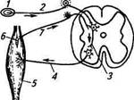 Рис. 13.7. Схема рефлекторной дуги с обратной связью: 1 — рецептор; 2—афферентный нейрон; 3— промежуточный нейрон; 4— эфферентный нейрон; 5—эффектор (мышца); 6— проприорецептор (мышечное веретено); 7— нейрон обратной связи; стрелки — направление прохождения импульса принципу осуществляются не только сложные поведенческие акты, но и поддерживается постоянство температуры тела, уровень сахара в крови, кровяное давление. Для примера можно привести следующий тест: перед испытуемым лежит молот, сделанный из картона, но имеющий вид настоящего молота. Он не знает, что молот легкий и, поднимая его, делает усилие. Так как масса предмета не соответствует данному усилию, получается некоординированный рывок. Но попросите испытуемого взять второй раз этот молот, и он возьмет его как легкий предмет, так как только что от рецепторов мышц его руки в ЦНС поступили сигналы о том, что предмет легкий. Таким образом, принцип обратной связи обеспечивает такое совершенное управление процессами со стороны ЦНС, которого не может быть при односторонней связи.