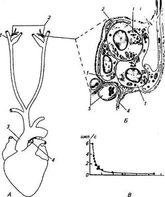 Рис. 15.20. Гистограммы афферентной импульсной активности, иллюстрирующие специфичность глюкорецепторов кишечника: А. Реакция глюкорецепторов на раствор глюкозы. Б, В. Реакция на растворы NaCl и КС1 (осмотичность как раствора глюкозы); стрелками показано начало действия растворов. Г. Реакция на сильное растяжение стенки кишки; горизонтальной линией отмечено время механического растяжения Рис. 15.21. Схема расположения каротидного и аортального телец (Л), участок каротидного тельца (Б) и зависимость частоты афферентных потенциалов действия каротидного тельца от содержания кислорода в крови (В): А. 1 — сонная артерия; 2 — место расположения каротидного тельца; 3 — аорта; 4— место расположения аортальных телец. Б. 1 — хеморецептор-ная клетка; 2— опорная клетка; 3 — афферентное нервное волокно; 4— эфферентное нервное волокно; 5— капилляры. В. По оси ординат — частота потенциалов действия в афферентном нервном волокне каротидного тельца, по оси абсцисс — напряжение кислорода в крови Каротидные и аортальные тельца. Структура и функция этих хеморецепторов наиболее изучены среди висцеральных рецепторов. Они являются хеморецепторами артериального русла и сосредоточены в двух зонах: при ветвлении общей сонной артерии между наружной и внутренней ее ветвями {каротидные тельца) и дуги аорты {аортальные тельца) (рис. 15.21, А). В основном эти рецепторы чувствительны к со-