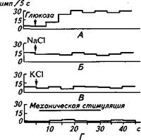 Глюкорецепторы. Обнаружены в желудочно-кишечном тракте и печени животных. Увеличение концентрации глюкозы вызывает повышение частоты афферентной импульсации в нервных волокнах, образующих эти рецепторы в желудке и тонком кишечнике (рис. 15.20, А). Однако известно, что изменение концентрации глюкозы влияет на осмотическое давление раствора, т. е. глюкорецепторы могут быть просто осморецепторами. При повышении осмотичности раствора за счет других веществ, например таких, как хлорид натрия или калия, не обнаружили какой-либо реакции со стороны глюкорецепторов (рис. 15.20, Б, В). Возбуждение глю-корецепторов адекватными стимулами приводило к быстрому повышению уровня инсулина в крови у животных. Надо отметить, что некоторые глюкорецепторы возбуждают и другие углеводы, причем выражена специфичность реакции различных рецепторов на тип углевода. Реакция глюкорецепторов печени зависит от концентрации глюкозы в крови: при низких концентрациях глюкозы в афферентных волокнах регистрируются потенциалы действия с определенной частотой, а ее повышение вызывает снижение частоты импульсации. Аминокислотные висцеральные рецепто-р ы. Рецепторные структуры, реагирующие изменением импульсной активности на аминокислоты, были обнаружены в кишечнике плотоядных животных. Эти рецепторы не активировались другими химическими веществами, а также механическим раздражением. Короткий латентный период ответов на глюкозу и аминокислоты позволяет считать, что эти рецепторы также находятся в слизистой оболочке внутренних органов животных. Осморецепторы. Во внутренних органах были обнаружены рецепторы, реагирующие на изменение осмотического давления окружающей их жидкости. Реакция данных рецепторов не зависела от природы вещества, с помощью которого было вызвано повышение осмотичности раствора.