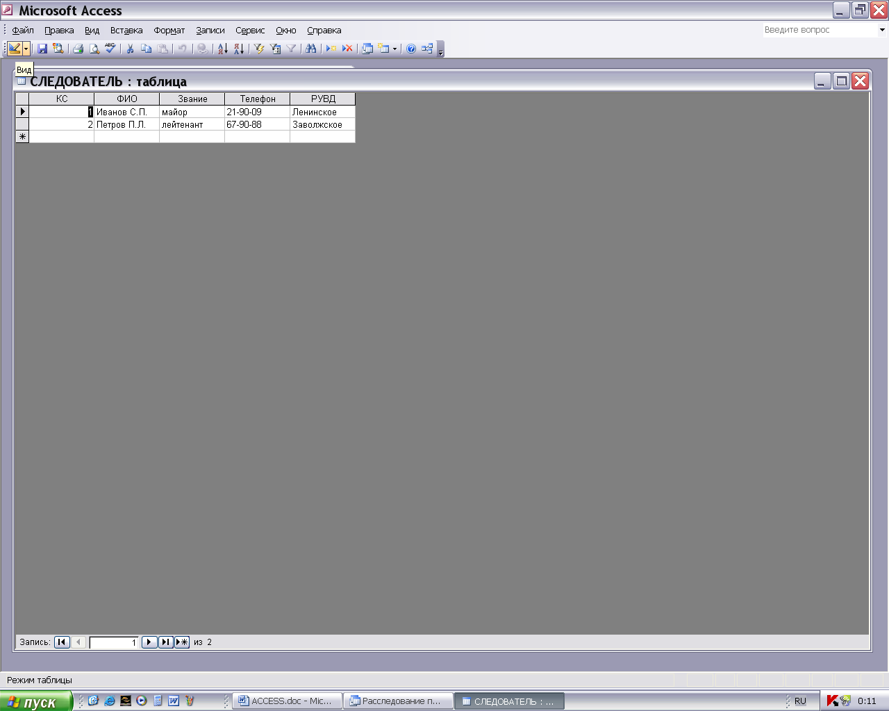 Между таблицами существуют отношения: "СЛЕДОВАТЕЛЬ", "ПРЕСТУПЛЕНИЕ" – отношения один-ко-многим; "СЛЕДОВАТЕЛЬ", "ЛИЧНЫЕ ДАННЫЕ " -отношения один-к-одному. Лабораторная работа №8. Создание базы данных и таблиц. Создайте базу данных «Расследование преступлений», содержащую три таблицы: "СЛЕДОВАТЕЛЬ", "ПРЕСТУПЛЕНИЕ», "ЛИЧНЫЕ ДАННЫЕ " следователя. Организуйте связи между ними. Порядок выполнения данного задания 1. Загрузите Access. 2. На вкладке Приступая к работе выберите Создать файл, затем Новая база данных. В окне Файл новой базы данных выберите нужную папку и введите имя базы данных. В нашем случае " Расследование преступлений". 3. Приступим к созданию таблиц. Создадим таблицу ЛИЧНЫЕ ДАННЫЕ в режиме Конструктора. На вкладке Объекты выберите Таблицы и Создание таблицы в режиме конструктора. 4. Задайте имена (вводятся с клавиатуры) и типы полей (выбираются из раскрывающегося списка). 5. Используя Мастер подстановок для поля семейное положение создадим раскрывающийся список значений. Для этого при определении типа поля семейное положение выберем Мастер подстановок и будем следовать его указаниям. 6. Сделайте поле Код следователя ключевым: щелкнуть правой кнопкой по полю Код следователя и выбрать ключевое поле или выбрать значок ключа на панели инструментов. 7. Сохраните таблицу ЛИЧНЫЕ ДАННЫЕ, используя Файл/Сохранить в окне Сохранение записываем ЛИЧНЫЕ ДАННЫЕ. В окне базы данных появилась новая таблица ЛИЧНЫЕ ДАННЫЕ. 8. Самостоятельно создайте таблицу ПРЕСТУПЛЕНИЕ в режиме Конструктора, к лючевым сделайте поле № УД. 9. Создайте таблицу СЛЕДОВАТЕЛЬ в режиме Таблица. На вкладке Таблица в основном окне базы данных выберите Создание таблицы путем ввода данных. После появления пустой таблицы, дважды щелкните на Поле1, текст в поле будет выделен, введите Код следователя, в поле2 – введите ФИО и т.д. Отрегулируйте ширину столбцов: подведите мышь к вертикальной черте между названиями полей, увидев двунаправленную стрелку, зажмите левую кнопку мыши и не отпуская, передвиньте на нужное расстояние. Введите несколько записей. 10. Перейдите в режим Конструктора таблицы, используя кнопку 11. Сохраните таблицу, задав имя СЛЕДОВАТЕЛЬ. 12. В итоге вы должны получить 3 таблицы 13. Занесите по несколько строк данных в таблицы, отслеживая взаимосвязанные записи. Для этого надо отобразить на экране две и более таблиц, используя Окно/Сверху вниз. 14. В таблице ЛИЧНЫЕ ДАННЫЕ для добавления фотографии используйте Вставка/Объект, в появившемся окне выберите Создать из файла. Выберите файл с расширением BMP. Рисунок отобразится только в форме или отчете, в таблице в поле фото будет указан вид объекта Точечный рисунок BMP. 15. Установим отношения между таблицами. Для этого выберем Сервис/Схема данных. На экране появилось окно Схема данных, в этом окне в контекстном меню выбираем Добавить таблицу. Добавьте все таблицы в окно Схема данных. 16. Установим отношения между таблицами СЛЕДОВАТЕЛЬ и ПРЕСТУПЛЕНИЕ, поле связи Код следователя. Для этого установите указатель в поле Код следователя ( таблица СЛЕДОВАТЕЛЬ) и, удерживая левую кнопку мыши нажатой, перетащите указатель в поле Код следователя ( таблица ПРЕСТУПЛЕНИЕ). Появится окно Изменение связей, которое представлено на рис.4.