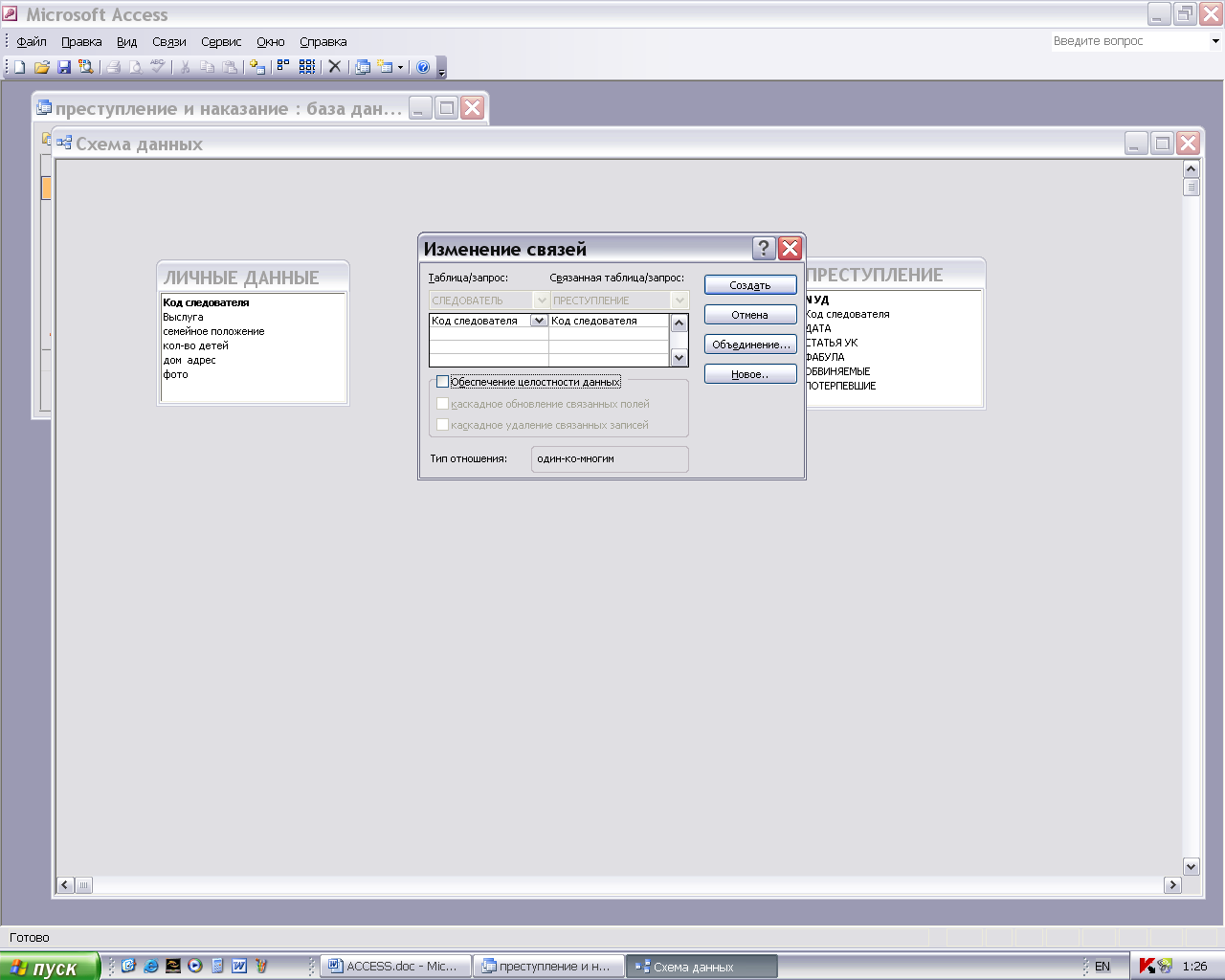 Рис.4 Окно изменения связей Установите флажки в Обеспечение целостности данных, Каскадное обновление связанных полей, Каскадное удаление связанных полей и щелкните по кнопке Создать. 17. Аналогично создать отношения между таблицами СЛЕДОВАТЕЛЬ и ЛИЧНЫЕ ДАННЫЕ по полю Код следователя. В результате схема данных имеет следующий вид см рис.5