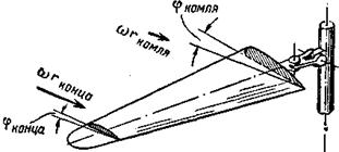 В комлевом сечении лопасти, как правило, используют профили с большей толщиной (например, профиль NACA 23015), чем на законцовке (профиль NACA 23012). Лопасти НВ вертолетов имеют отрицательную, обычно линейную крутку, так что у комля они работают на больших углах атаки (рис. 3.6). Это дает более равномерное распределение аэродинамических сил вдоль лопасти и уменьшает индуктивные потери НВ, вызываемые неравномерностью распределения потока. Геометрическую крутку задают, ориентируясь на статистические данные. Чаще всего на легких вертолетах крутка лопасти НВ составляет Δφ = -5…-9°.