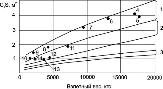 Рис. 3.8. Изменение сопротивления "вредной" пластинки, эквивалентной вертолету в зависимости от его взлетного веса: