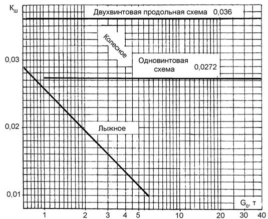 где ‑ коэффициент относительной массы шасси: для полозкового шасси = 0,012…0,027; для неубирающегося колесного шасси = 0,02…0,028; для убирающегося шасси ≈ 0,03…0,035 (бóльшие значения для вертолетов категории Е-1-Л1).