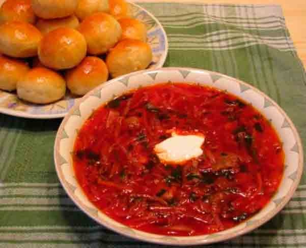 Інструкційна картка На страву: «Борщ український» Підстава: В.С. Доцяк «Українська кухня», ст. 186 Мета: Навчитися готувати страву «Борщ український», з дотриманням якості в роботі, технологічних норм, правил техніки безпеки та вимог санітарії і гігієни. Обладнання, інвентар: обробна дошка, кухарська трійка ножів, електрична плита, виробничий стіл, ложка, шумівка, сковорода, жарова шафа. Сировина: буряк, капуста, картопля, морква, петрушка, цибуля, часник, томатне-пюре, борошно, сало, жир, цукор, оцет, перець солодкий, дріжджі, олія, яйця. Послідовність виконання робіт 1. Підготовлене м'ясо, кістки, відварити. 2. Бульйон процідити. 3. Нарізати буряк соломкою, додати оцет, жир, томат-пюре, додати бульйон, тушкувати до напівготовності 1-1,5 год. 4. Цибулю, моркву петрушку шаткують соломкою і пасерують з жиром. 5. М'ясо-кістковий бульйон процідити, довести до кипіння. 6. Закласти в киплячий бульйон картоплю нарізану часточками, довести до готовності. 7. Додати нашатковану капусту варити 10-15 хв. 8. Додати тушковані буряки, пасеровані овочі. 9. За 5-10хв. до закінчення варіння кладуть солодкий перець нарізаний соломкою, пасероване розведене бульйоном борошно, сіль, цукор, спеції. 10. Готовий борщ заправити салом шпик, розтертим з часником, настояти - 20хв. 11. Відпустити у підігрітій великій тарілці, покласти кусочок мяса, налити борщ, покласти сметану. 12. Приготування пампушок 13. Готуємо дріжджове тісто безопарним способом: 14. У теплу воду додати розчинені і проціджені дріжджі, цукор, сіль, просіяне борошно. 15. Добре вимісити до однорідної консистенції. 16. Тісто поставити в тепле місце для бродіння на 3,5-4год., періодично обминають для бродіння. 17. З підготовленого тіста формують кульки масою 30г, щільно укласти на змащений жиром лист, щоб воно підійшло. 18. Змастити яйцем і випікати 7-8хв. Приготування часникової підливи: Часник розтерти з сіллю, додати олію і переварену охолоджену воду. Набір сировини на 1 порцію